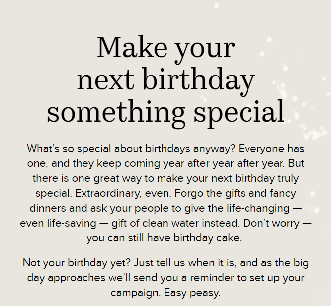 This section on the main website showcases the overall progress of the charity. This again shows the effectiveness of the webs influence and the organisations success which further supports the point that web has had a positive influence onto non profit organisations. Charity: Water does a great job using the web to connect with donors and keep things open. They share real-time updates with GPS and photos so users can see exactly where their money’s going. With creative online campaigns like “The Birthday Pledge,” they make it easy for people to get involved and help bring clean water to those in need.