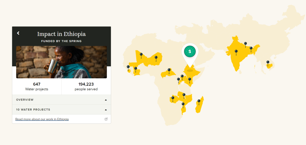 This content also shows where and how the users donations will be used which is displayed only once the user has clicked onto a certain pinpointed location. This encourages the user to click around the various locations and therefore increases interactivity within the website and encourages donations due to the people served and water projects.